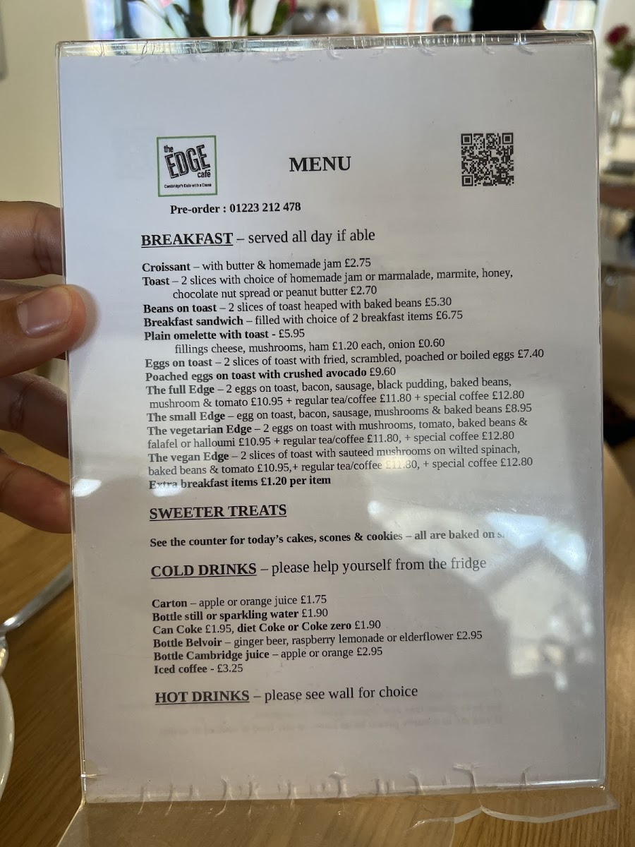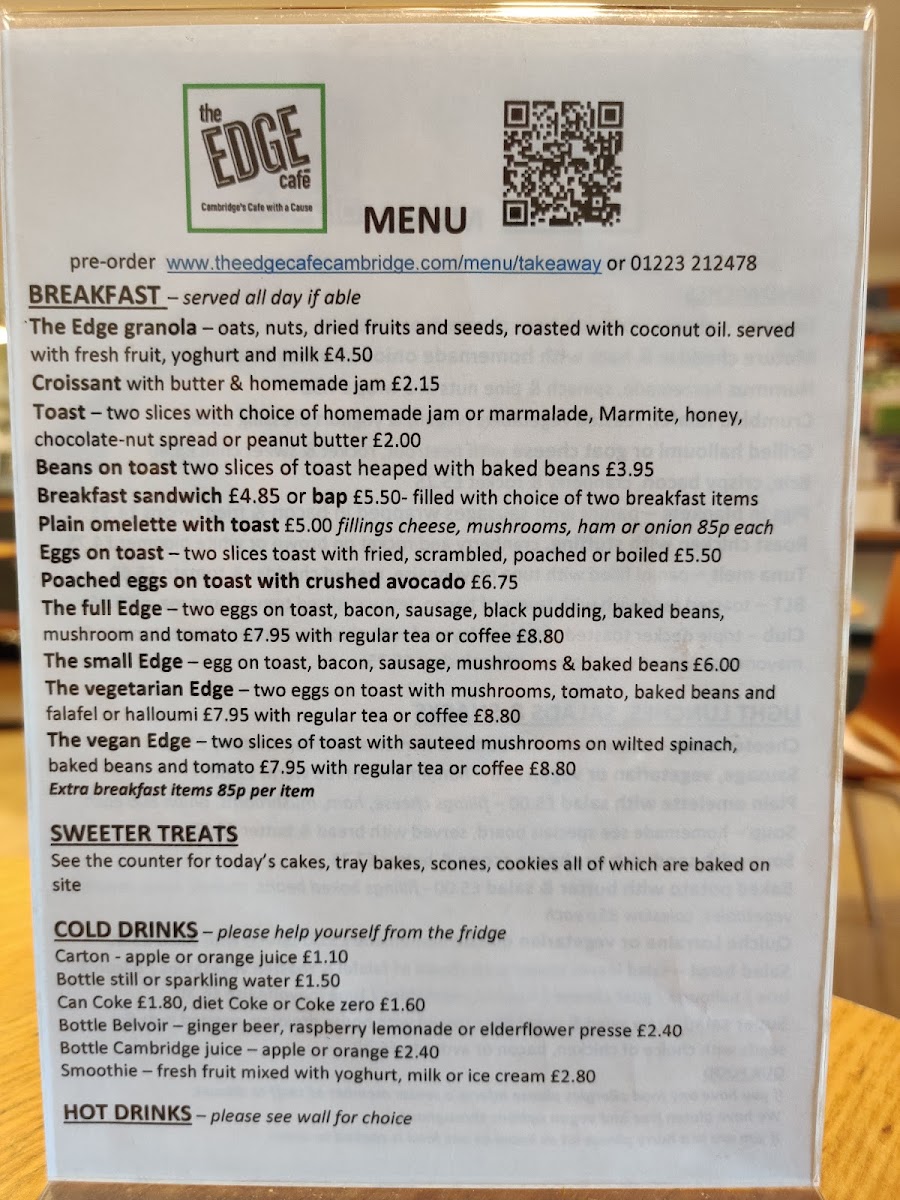 Welcome to The EDGE Cafe, a charming eatery located at 351 Mill Rd, Cambridge. This café is more than just a spot for a quick bite; it serves as a community hub where warmth and camaraderie flourish. The café’s breakfast menu boasts a delightful array of options, from flaky croissants (£2.75) to hearty full-edge breakfasts (£10.95) that promise to kickstart your day with flavor.