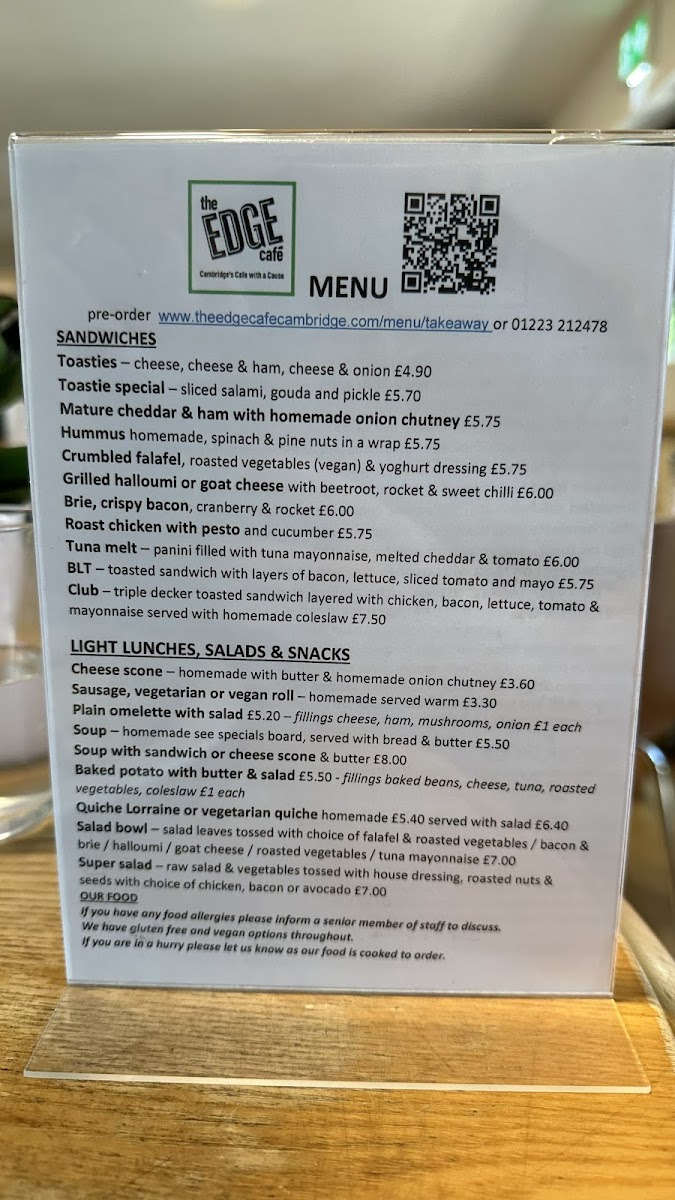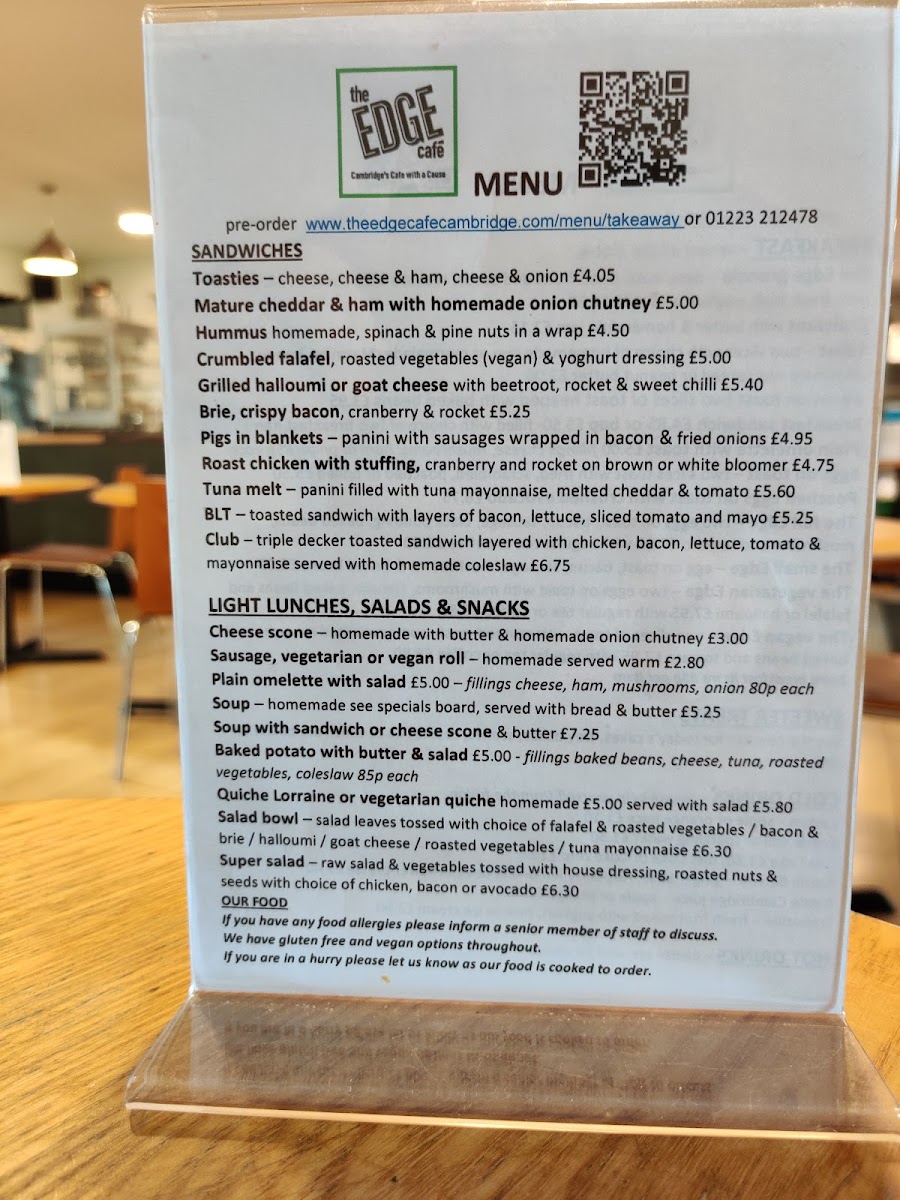Vegetarian and vegan options are plentiful, ensuring everyone finds something to enjoy. An enticing selection of hot drinks, including lattes and mochas, alongside refreshing cold beverages like iced coffee (£3.25) and Cambridge Juice (£2.95), rounds out the menu. The atmosphere here is inviting; it’s a place where you can savor each bite while engaging in delightful conversations. With friendly staff and a cozy environment, The EDGE Cafe truly stands out as a must-visit gem in Cambridge.